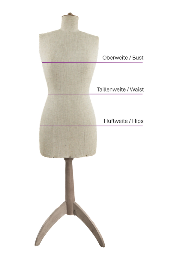 Ich fertige die Corsage genau nach Ihren Maßen an. Für die Schnitterstellung benötige ich daher Ihre Oberweite, Taillenweite, Hüftweite und Körpergröße. Wo diese Weiten genau gemessen werden, ist auf der Abbildung mit der Maßbüste ersichtlich.